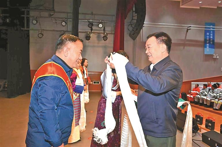 11月28日,中华全国总工会、中国职工发展基金会慰问西藏一线职工爱心物资捐赠仪式举行。自治区党委书记王君正,中华全国总工会副主席、书记处书记马璐出席。这是王君正向我区全国劳模代表敬献哈达。本报记者 李洲 摄
