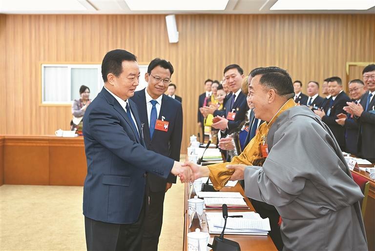 2月1日下午,自治区党委书记王君正参加自治区十二届人大四次会议阿里代表团审议。这是审议开始前,王君正与代表握手交谈。本报记者 旦增西旦 摄